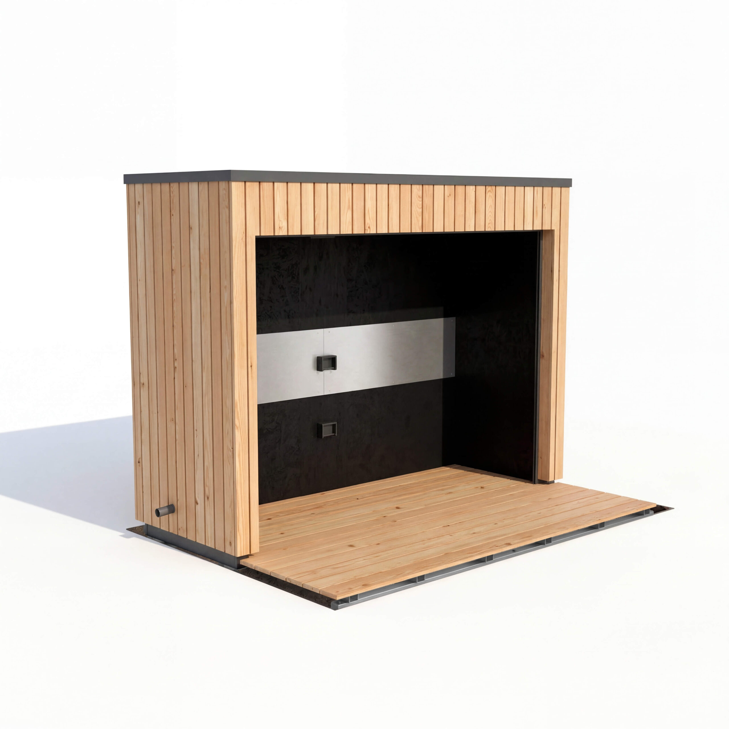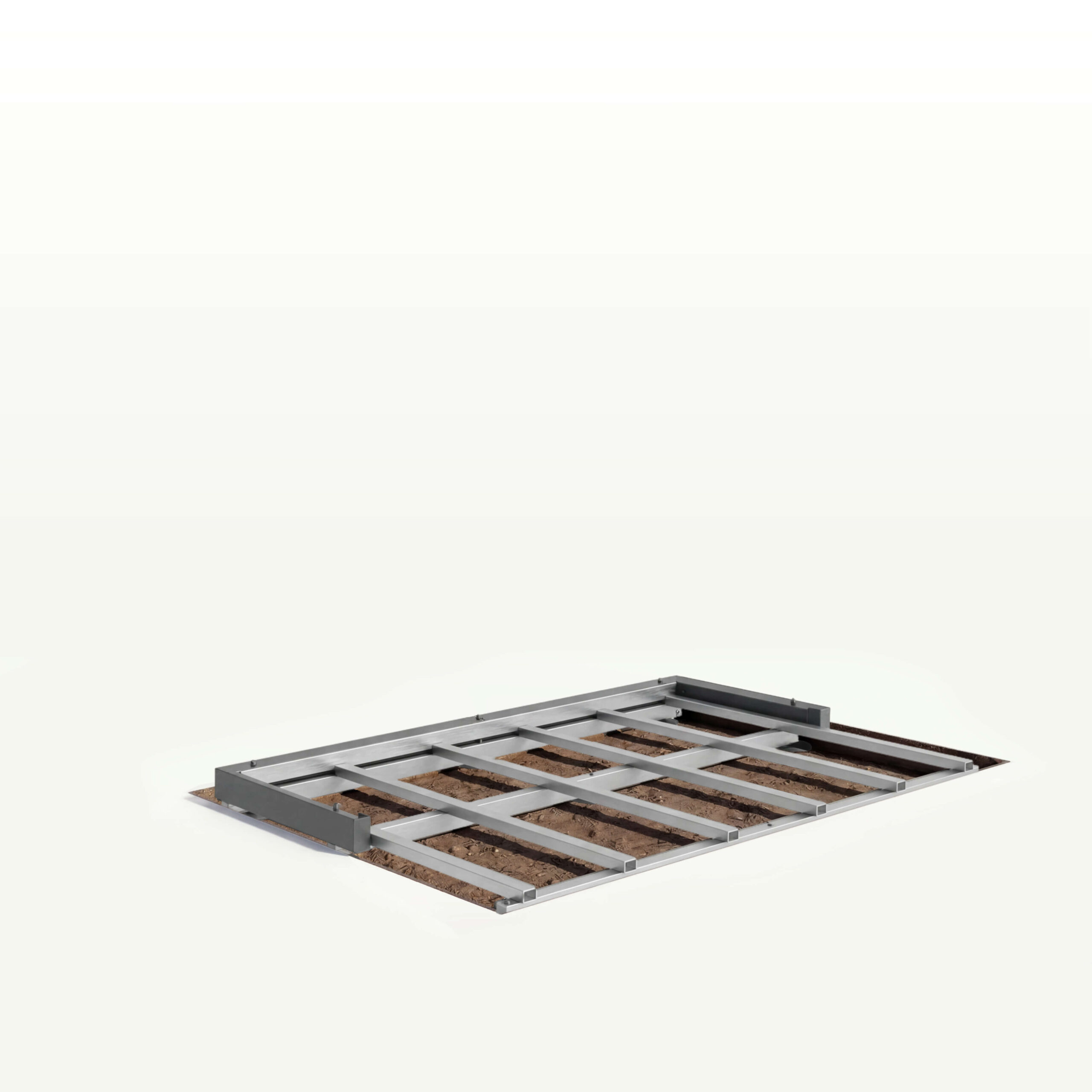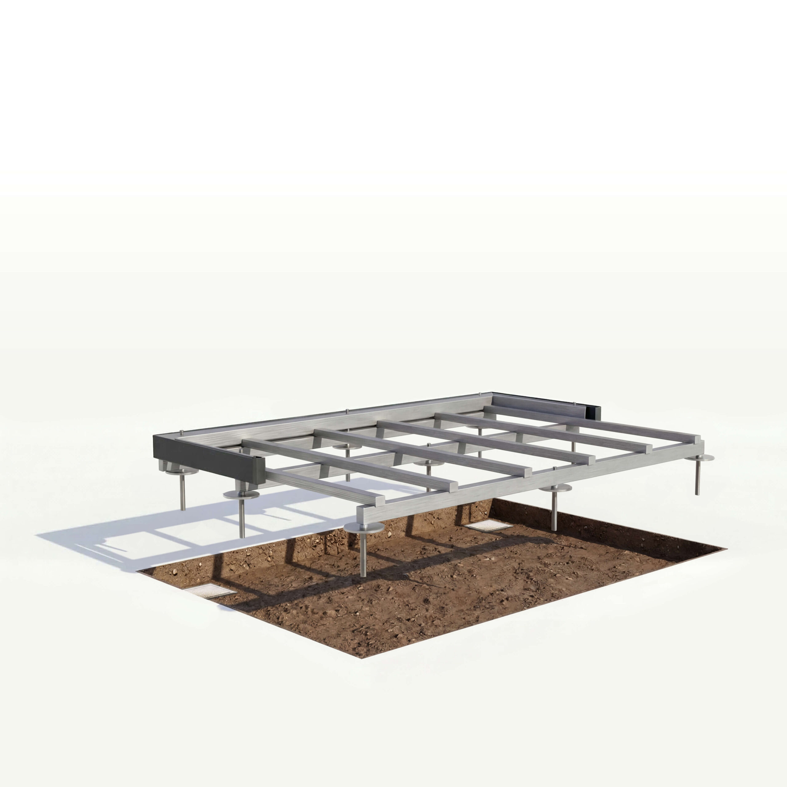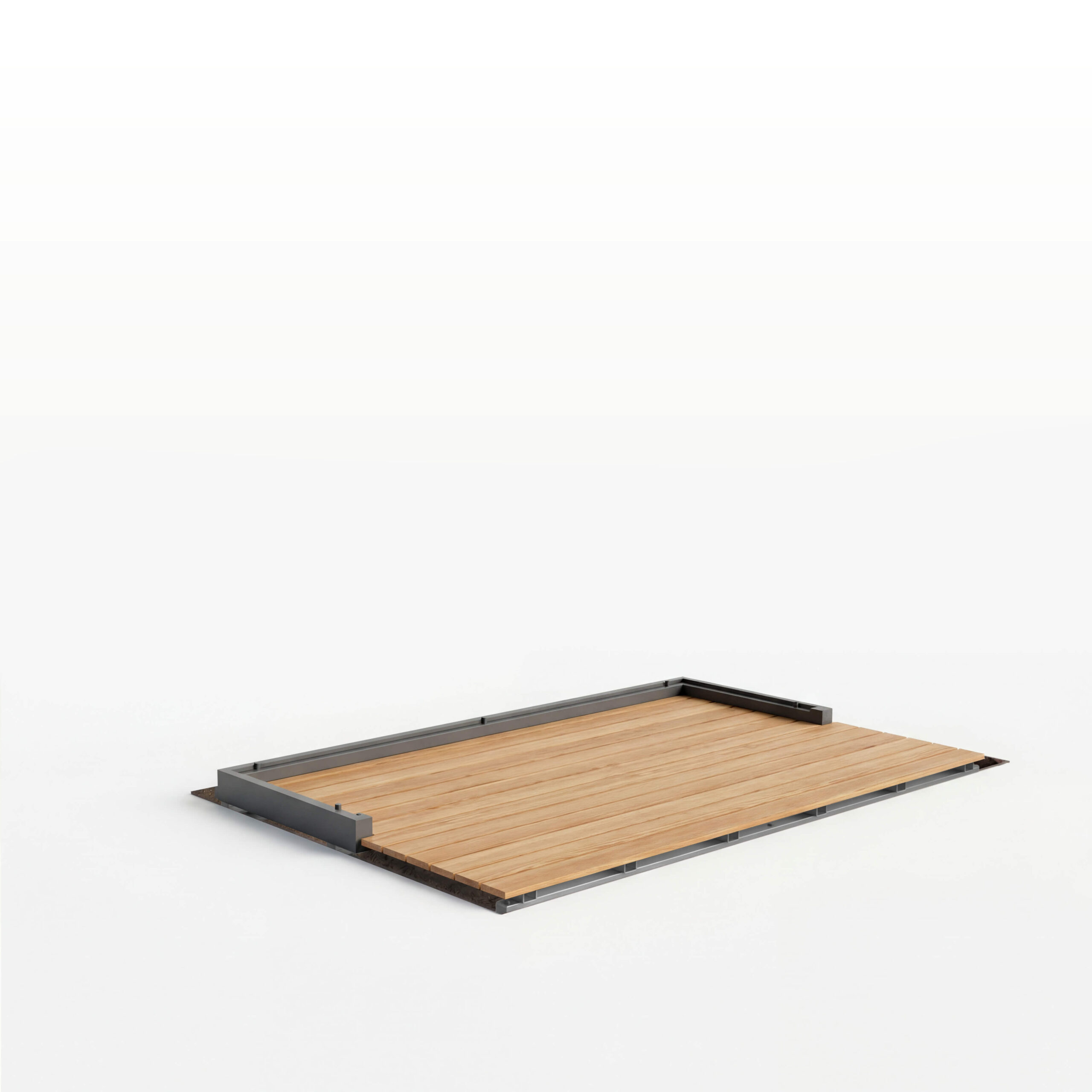 Um den Kochschuppen auf einer freien Fläche mit weichem Untergrund aufzustellen, benötigst Du unser optionales Aluminium Podest mit Holzdeck.