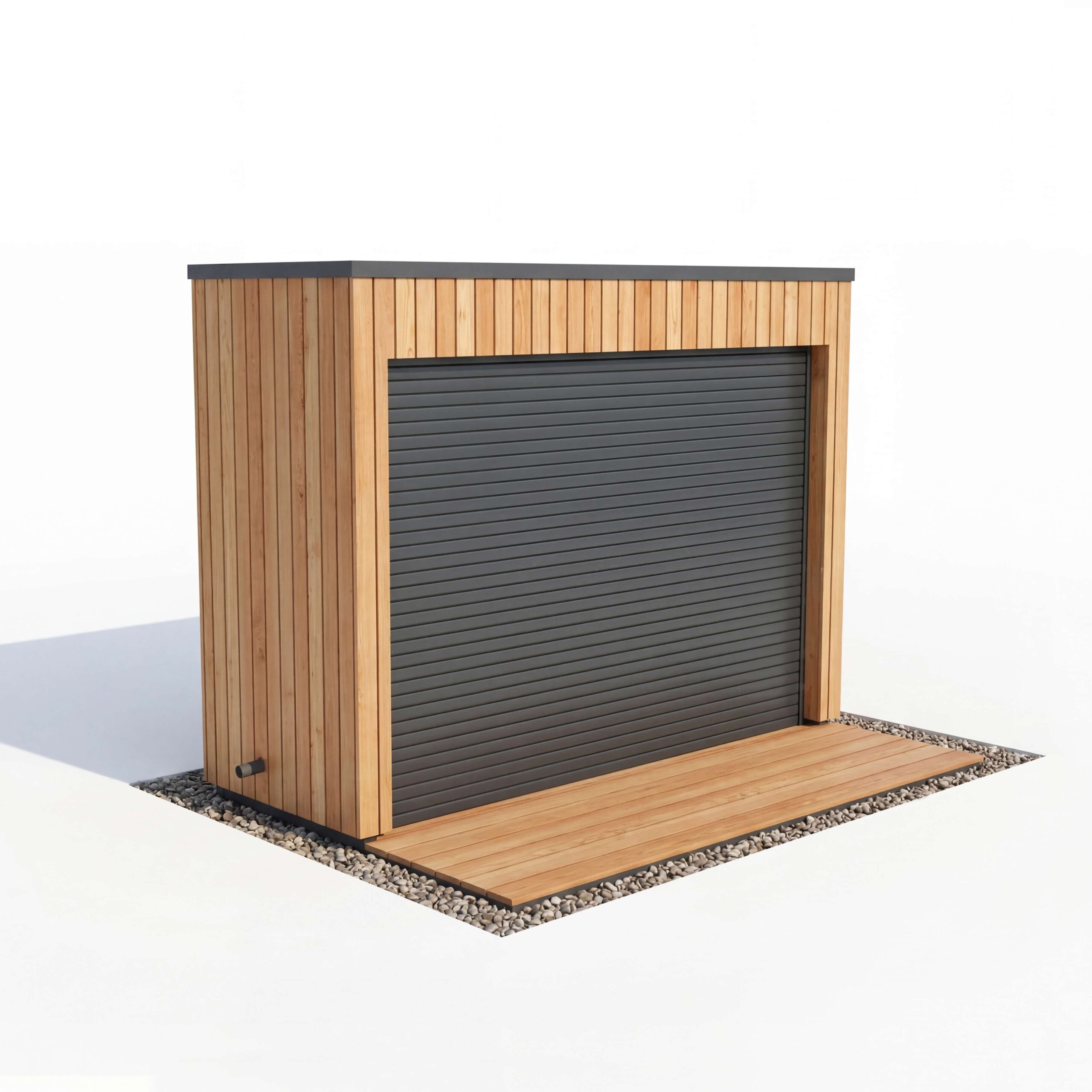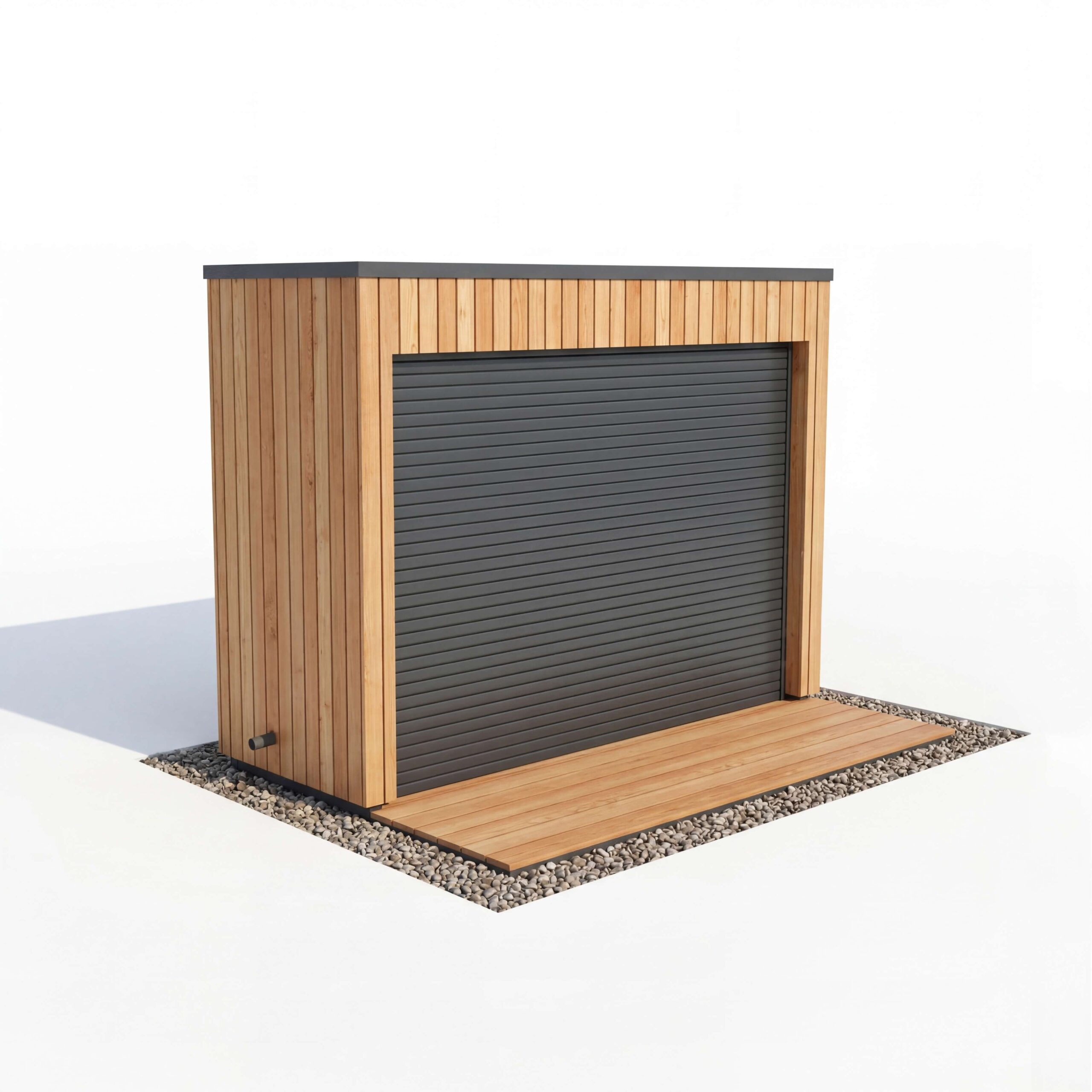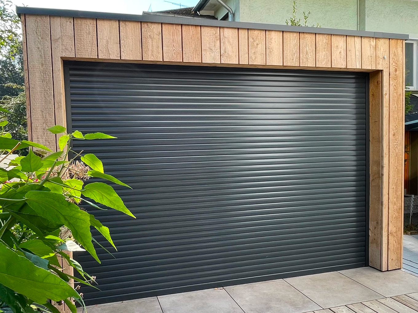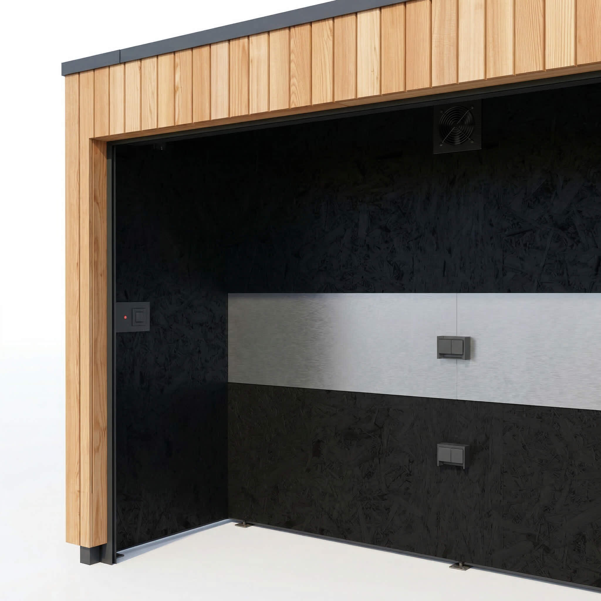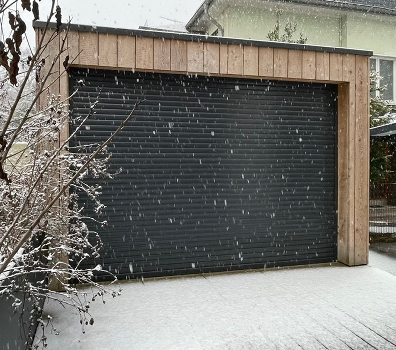 Das elektrische Rolltor lässt sich bequem mit einer Fernbedienung bedienen und stoppt beim Herunterfahren automatisch, sollte sich ein Hindernis im Bereich der Lichtschranke befinden.