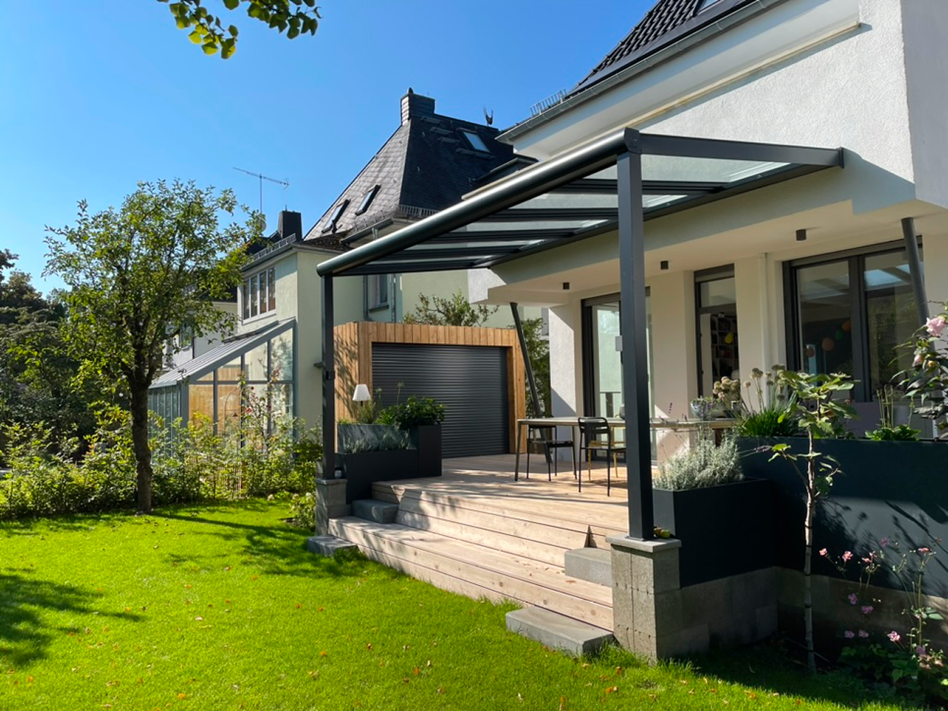 Eine hochwertige EPDM-Dachfolie schützt deinen Kochschuppen gegen Regen und Schnee. Das Fallrohr läuft versteckt in der Außenwand rechts oder links (wählbar) und entwässert in den Garten. Ein umlaufendes Dachrandblech aus Aluminum bildet einen sauberen Abschluss.