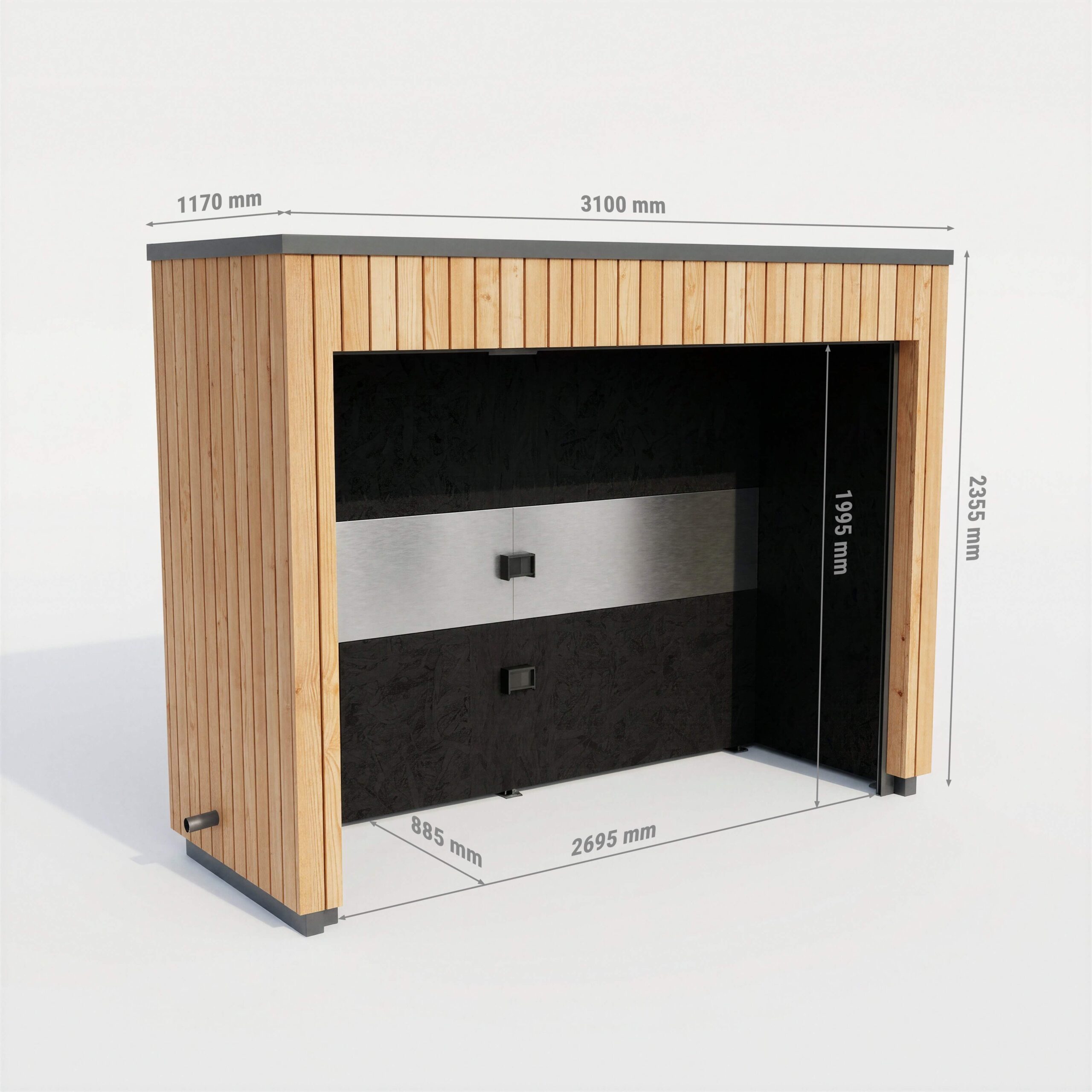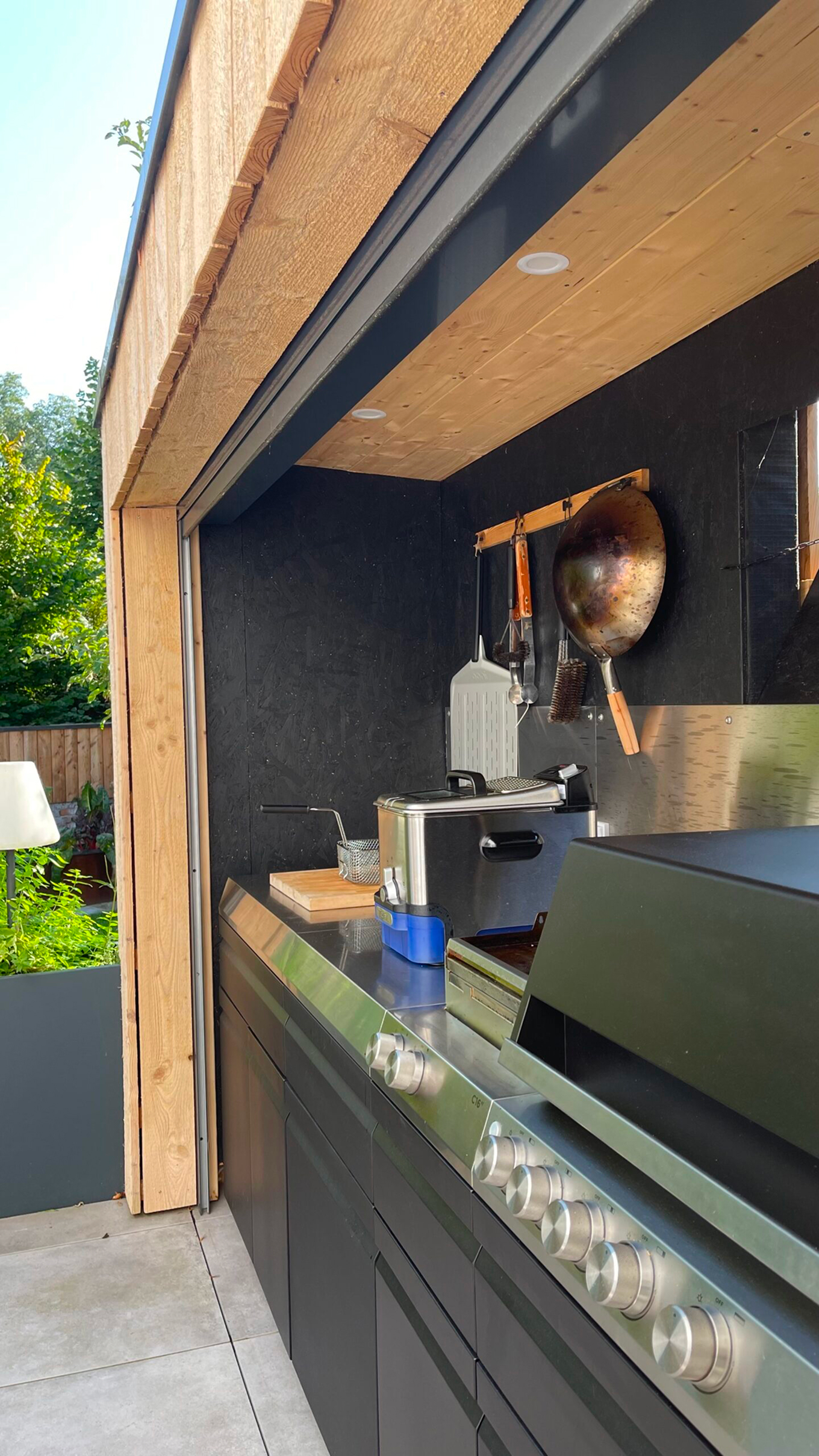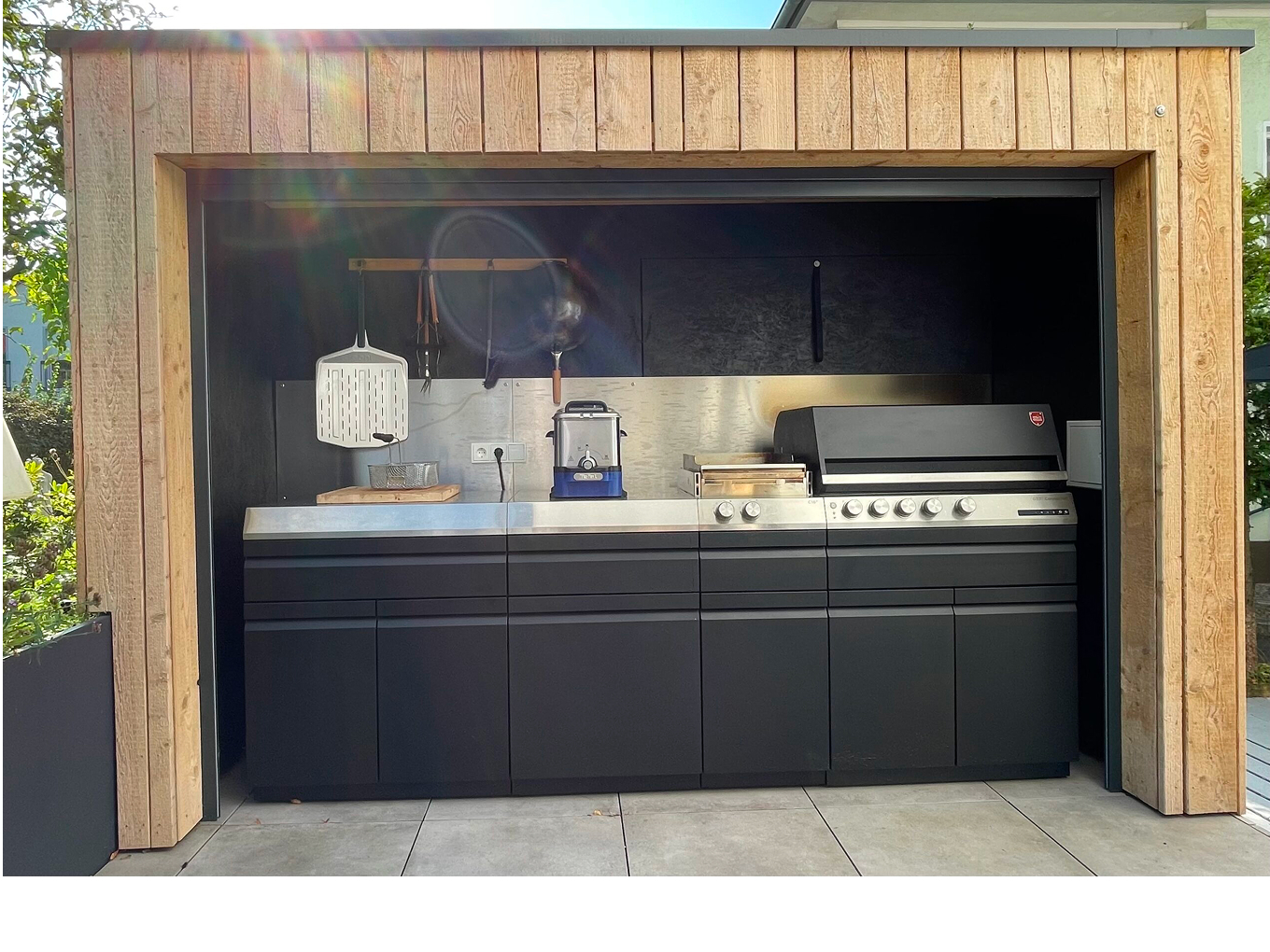 Es finden Outdoorküchen bis zu einer maximalen Breite von 269,5 cm* im Kochschuppen einen geschützten und trockenen Platz.